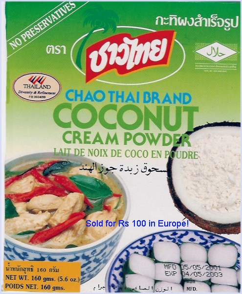 been packing and exporting many tropical fruits. For example, the above is the wrapper of JackFruit (the name originated from Malayalam 'chakka'), canned in Thailand and available in most Western European Capitals. It is sold for about 2 dollars (about 95 rupees). As you can see it contains about 7-10 "chakka chula" (230 grams). We have also seen ripe Jack Fruit itself sold in the shop. It costs about 6 dollars for a Kilogram. This is the price for 'raw chakka including the shell'. A medium sixed Jack fruit weighs at least 4 Kilo. This means a Jack Fruit costs 24 dollars in the open market. The market we scanned had a tax of 12% on the foods. Removing this, the price is about 20 dollars = 800 rupees. Of course this should cover the transport by air, damage costs and the profit. In Kerala one can buy such a Jack Fruit for about 10-20 rupees! Very often many farmers don't get anything. Many just pluck what they need for home use and the excess fruits just fall and get wasted. These are only some examples. One can take mangoes, papaya etc. Some limited quantity is indeed exported. But that number is very low and is also monopolized by some companies and they are happy with the limited market they are covering (Gulf, UK for example). The concept is not widepsread. The real farmer doesn't get the benefit. From West to EastWhat we have seen above is an export from East to West. There are also plenty of products exported from West to East. Small countries like Denmark and Holland, though perceived as industrialized countries, also make billions of dollars of revenue from agricultural products - a fact very often not known by the public in India and ignored by our so called 'educated elites'. Both these countries export beer (an agricultural product), milk products. Holland also make billions from flowers alone. Danes on the other hand export frozen chicken and chicken products. Here is the wrapper of a Danish product - chicken based sausage. Normally sausages are made of pork. But many in the Eastern World do not take pork. So the easy acceptable substitute is chicken.