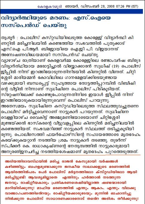 severely beaten. In the end Sudheesh jumped from the Police Jeep