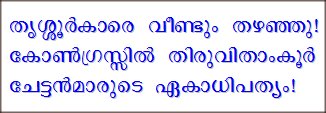 Sudheeran is not standing to the disappointment of Oommen Chandy who wants to pack VM Sudheeran to Delhi. But both Chennithala and Sudheeran seem to be eyeing for seats in Kerala Assembly. In Trichur, a candidate has been imported from Travancore once again, as if there are no elegible Congressmen here! PC Chacko had once left Congress blaming Indira Gandhi only to come back when he realized ground was splitting under him! Even Tom Vadakkan would have been a better candidate!