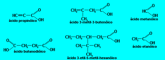 A nomenclatura dos ácidos carboxílicos segue as regras já vistas, com a exeção que o sufixo é óico. Deve-se numerar a cadeia começando da extremidade onde há o grupo carboxila.