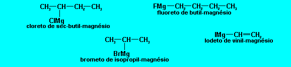 Entre os organometálicos, os mais importantes são os compostos de Grignard, com um radical ligado a um átomo de magnésio, que está ligado a um halogênio. Na sua nomenclatura escrevemos o nome do ânion do halogênio, seguido do radical e da palavra magnésio: