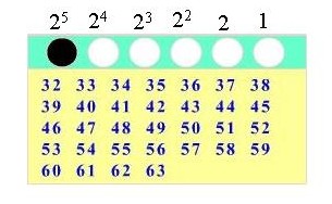 其中an、an-1 ... a2、a1、a0等於1或0,例如 ,46這個數可以表達為1 x 25 + 0 x 24 + 1 x 23 + 1 x 22 + 1 x 2 + 0 x 1。因此在二進制下,46這個數便寫成101110。神算卡上的數字其實反映了0至63這64個整數(註 2)的二進制表示法。每張卡上的6個孔其實代表2的某一個冪,從左至右依次代表25、24 、23、22、2和1。其中黑孔代表1,白孔代表0。每張神算卡按照其黑孔所在的 位置,分別代表2的某個冪。例如第六張卡的黑孔出現在最左邊,因此這張卡代表25,如此類推。