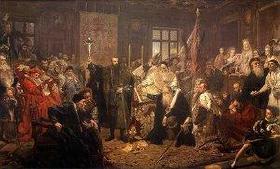 | 波蘭自14世紀建立統一國家和擊敗條頓騎士團後,逐漸成為東北歐的重要國家。1386年立陶宛 大公約蓋拉Iogaila兼任波蘭國王(稱弗拉迪斯拉夫二世Wladislaw II),開創波蘭歷史上的「雅蓋羅 Jagiello王朝」,使兩國開始走向聯合。從1434年起兩國形成較為穩定的「君合」關係。1561年立陶宛取得立 窩尼亞Livonia北部地區,次年成立征服者政權-立窩尼亞親王國,自此波蘭國王又以立陶宛大公的 身份兼任立窩尼亞親王。1569年7月1日兩國貴族在盧布林Lublin議會上訂立《盧布林聯合令》,宣佈兩國組成 「政合國」-波蘭-立陶宛Poland-Lithuania王國(又稱波蘭-立陶宛聯合體Polish-Lithuanian Commonwealth),成立共同議會。自此波蘭遂控制立陶宛及其屬地立窩尼亞、烏克蘭Ukraine和白俄羅斯Belarus ,成為東歐強國。17-18世紀波蘭-立陶宛走向衰落,在18世紀末曾先後三次為俄羅斯、奧地利和普魯士瓜分, 至1795年1月7日波蘭-立陶宛(連同其屬地)被瓜分殆盡,最終滅亡。 |