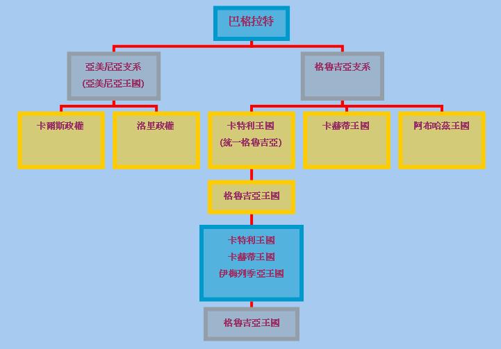 合,形成多個地方政權,其中卡特利、卡赫蒂、伊梅列季亞Imereti等政權乃由該支系統治。1762年格魯吉亞重