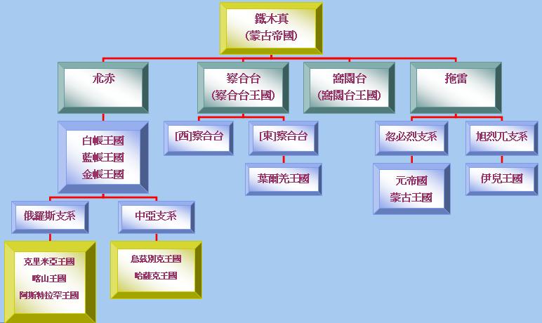 1. 長子朮赤Juchi繼承了西伯利亞和俄羅斯的領地,其後裔先後建立白帳White Horde、藍帳Blue