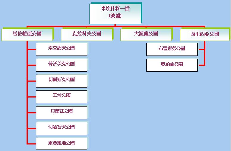 皮亞斯特家族是波蘭的統治家族。966年大波蘭部落聯盟首領米埃什科一世Mieszko I建立波蘭公國, 是為波蘭立國和皮亞斯特王朝之始。1138年公爵博萊斯拉夫三世Boleslaw III退位,分封諸子,波蘭分裂為馬 佐維亞Mazovia、克拉科夫Cracow、大波蘭Greater Poland和西里西亞Silesia四個公國。分裂初期波蘭尚設有 大公,由克拉科夫公爵兼任,為諸國之宗主。但由1227年起波蘭再無大公,陷入完全分裂狀態。與此同時,前 述的四大公國又相繼分裂為更小的政權,其中從馬佐維亞分裂出索查謝夫Sochaczew、普沃茨克Plock、切爾斯 克Czersk、華沙Warsaw、貝爾茲Belz、切哈努夫Ciechanov和庫賈維亞Cujavia等公國,從西里西亞分裂出布雷 斯勞Breslau和奧珀倫Oppeln兩公國。上述分崩離析的狀態直至14世紀才有所轉變。在1320年克拉科夫、大波蘭 和庫賈維亞重新合併為波蘭王國(馬佐維亞和克拉科夫地區其後又分裂出更多政權,前者直至16世紀初始重新併 歸波蘭,而後者則成為波希米亞的領地)。重新統一後的波蘭起初仍由皮亞斯特家族統治,但在1370年皮亞斯特 王朝滅亡,終於結束它統治波蘭四百多年的歷史。