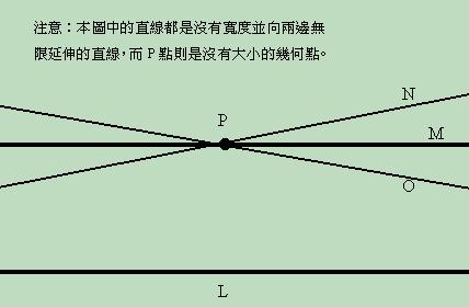 在當時不為世人所接受。人們難以想像在下圖中除了直線M外,何以還有其他通過P點而與L不相交的直線,因