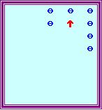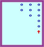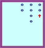 上圖中紅色箭頭指著的一檔就是我們當前要處理的一檔(以下簡稱「當前檔」)。由於「除數」是3,我們要運用 3的歌訣。應用「3逢6進2」,先從「當前檔」撥走6粒珠,然後在其左面的一檔(「進」就是指當前左面的一檔) 撥上2粒珠。由於「當前檔」尚餘1粒珠未處理,紅色箭頭仍留在「當前檔」中: