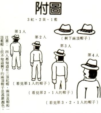 前面的3個人的帽子,想了想後答曰:「不知道」。接著我問3號同樣的問題,他也望了望前面兩個人的帽子,