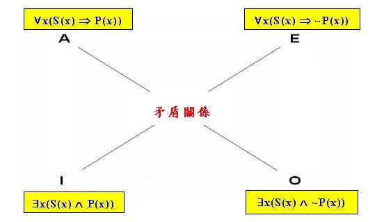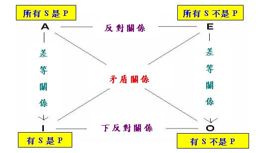 」、「下反對(Subcontrary)關係」和「差等(Subalternate)關係」,以下簡述這四種推理關係的意義。「矛盾