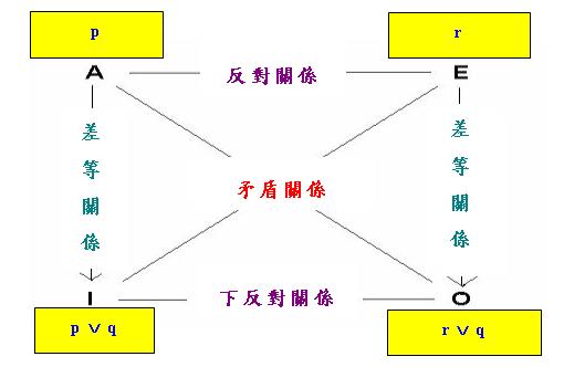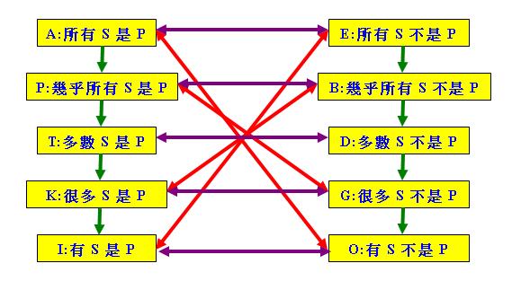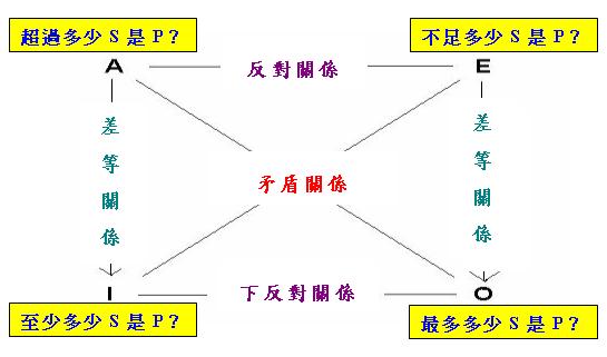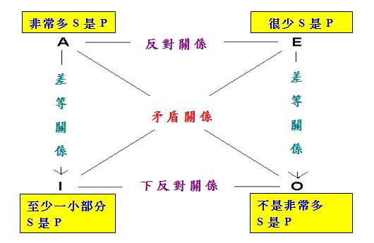 等關係」。「(下)反對關係」也非只圖中所示的5個,而是有更多。例如O句便與P句存在「下反對關係」,這是