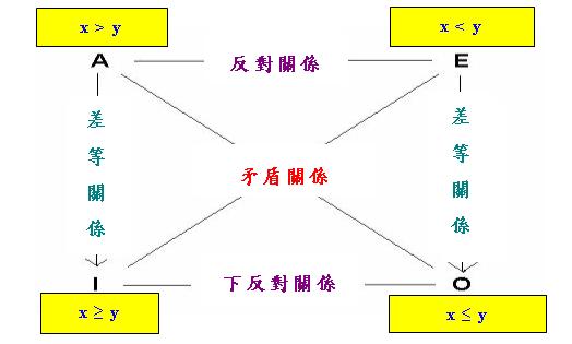 有「x < y」(即E句)真,反之亦然。同樣,在「古典對當方陣」中,I句可以被拆解成「所有S是P或部分S是P」