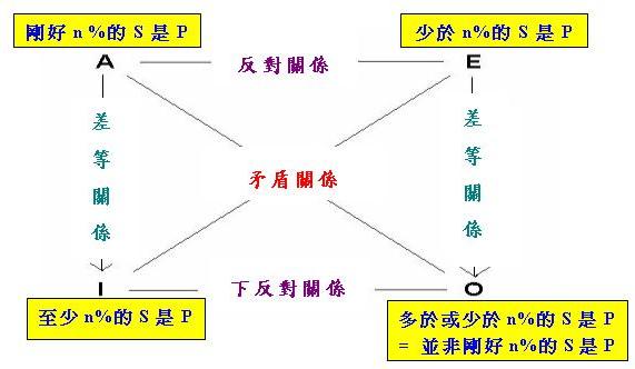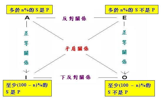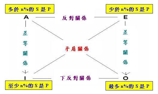 輯上等同於「少於(100 − n)%的S是P」(請讀者自行驗證這一點),而I句與E句須處於「矛盾關係」,這