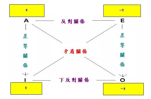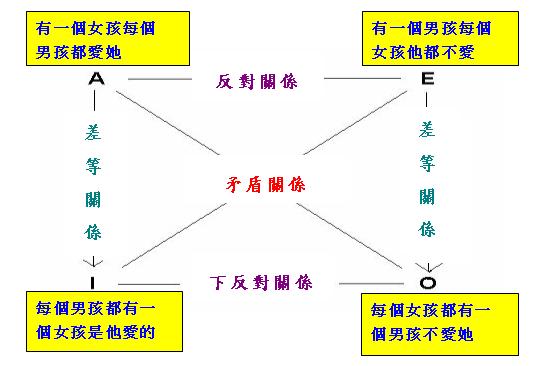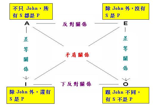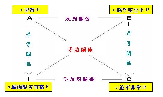 P」和「所有S不是P」,即E句是把A句的系詞「是」改為「不是」而成,I與O句之間的關係也是如此。但在上述