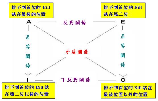 現在讓我們驗證上述方陣中的「反對關係」。由於隊伍包含至少4人,而且至少有一人站在Bill之前,方陣中的 A和E句顯然不可同真,但可同假,令這兩句同假的情況就是Bill站在第三至倒數第二位置之間的任何一個位置 (例如第三位),請注意此一情況亦可作為I和O句可同真的例證。