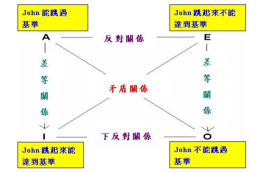 從這個「對當方陣」,我們可以得到某些推理結果,例如John跳起來可以既達到基準,又跳不過基準(此即上面 中圖的情況),但絕不可能既達不到基準,又跳過基準,等等。