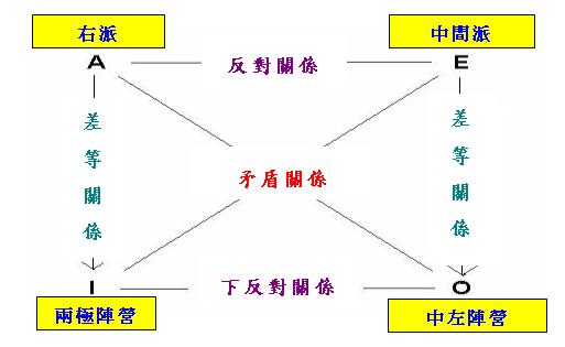 從這個「對當方陣」,我們可以得到以下推理結果:如果某人不屬於「中間派」,那麼他必定屬於「兩極陣營」