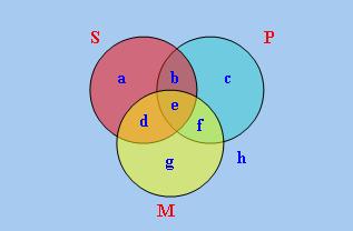 們要證明上面(1)的有效性,為方便證明,我們參照以下「溫氏圖」以字母標示S、P、M及其否定的各種交集的