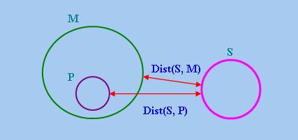 但上式過於繁複,不方便進行推理,所以以下改用文字與符號夾雜的方法。為簡化討論,以下只考慮一個特殊 情況,就是假設S、P和M僅包含平面上的一個點。為易於理解,讀者可參考下圖: