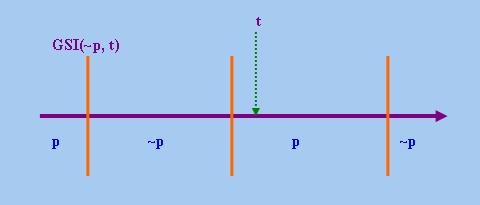 在上圖中,時間軸被分割為交替的p和~p區域(因為一個行為/事件可以發生不只一次,即在不同的時段中先後 為真),每個區域都有一個「下確界」(Infimum),代表該區域的起點。對於p (或~p)而言,我們可以有多個p (或~p)區域的「下確界」。但在給定時間t後,我們便可以在這眾多「下確界」中,確定唯一一個早於且最接近 t的「下確界」,稱為「最大較小下確界」(Greatest Smaller Infimum),記作GSI(p, t) (或GSI(~p, t))。利 用上圖,我們便可以把"already"的真值條件表達為下式(Lobner原本使用謂詞邏輯的符號「∃」 ,為與筆者以往使用的表達法一致,這裡採用「三分結構」的形式):