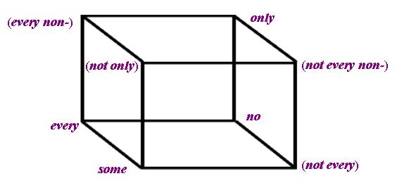 利用"every"以及上述七個否定形式,我們便可以把前述的「新型對當方陣」擴大為以下的「對當 立方體」(Cube of Opposition)(註9):
