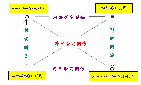 從某一角度看,上一章介紹的「外部否定」、「內部否定」和「對偶」概念是對傳統「對當關係推理」的一種 改造。「對當關係推理」是「古典形式邏輯」所研究的量化句推理的一種,古代學者把這種推理總結為以下的 「古典對當方陣」: