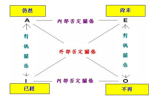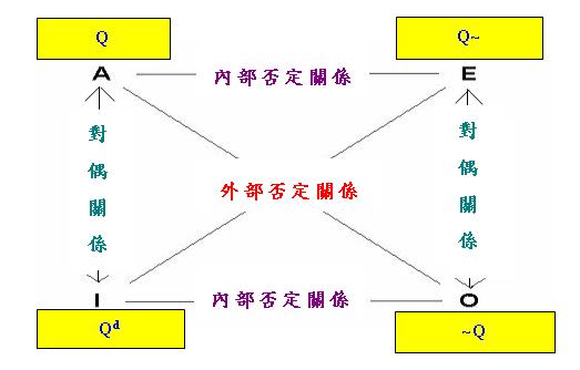 由於「對偶關係」是對稱的,所以上圖中A與I句以及E與O句之間的箭頭是雙向而非單向的,而且「對偶關係」
