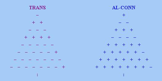 AN-SYM且不違反「非平凡性」,當且僅當其「數字三角形」的最右一「行」上剛好有一點取「+」號,而「數字