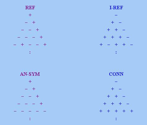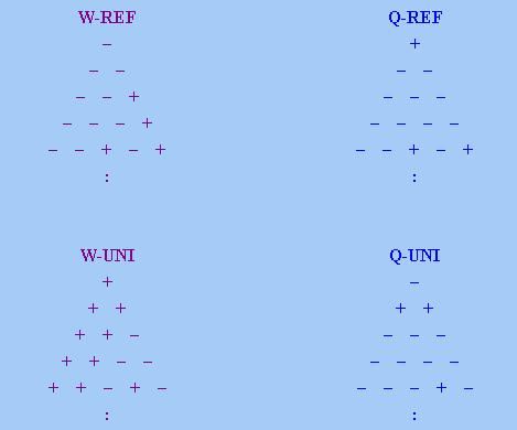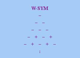 根據上式,Q ∈ W-SYM當且僅當其「數字三角形」上若有兩點取「+」號,只要該兩點不在同一「列」或同 一條「對角線」上,那麼其中一點所在「列」以及另一點所在「對角線」的交點也取「+」號(如果該交點在「 數字三角形」上的話)。下圖顯示W-REF的「數字三角形」特徵: