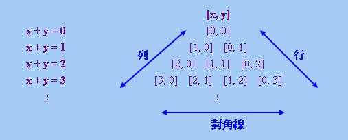 請注意學者一般把「數字三角形」上的三個方向分別稱為「對角線」(Diagonal)、「行」(Row)和「列」