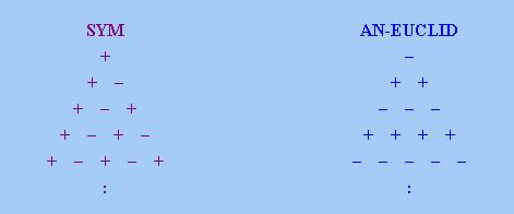 至於其餘兩點,(v)是說,「對稱限定詞」的「數字三角形」上每「列」要麼全為「+」號,要麼全為「− 」號。(vi)是說,「反歐幾里德限定詞」的「數字三角形」上每條「對角線」要麼全為「+」號,要麼全為「 −」號。請注意此一結果跟《廣義量詞系列:單調性的進階研究》 5.3小節中的圖完全吻合(請記著在本文中,SYM等價於INT)。由此也證明了,本文對「反歐幾里德性」的定義跟 上述網頁的定義等價。下圖顯示上述兩種性質的「數字三角形」特徵: