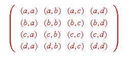 在上式中,D是由FAMILY中所有成員組成的集合,D2則是由D中成員組成的所有「有序對」組成的集 合,我們可以把這個集合的元素寫成「方陣」(Square Matrix)的形式,而diag(D2)就是這個方陣 的「主對角線」(Main Diagonal)上的元素。舉例說,設D = {a, b, c, d},那麼D2可以表達為下 列方陣: