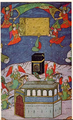 An explanation: In many of the images in this web site, you will notice that Mohammad's face is obscured. That is, the details are not there. Most likely, the Turkish artists out of veneration did not draw the details on Prophet's face. However, the Persian artists, who are mostly Shiite, did draw Muhammad's eyes, nose, eyebrows, etc.