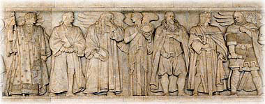 The 18 lawgivers looking down on the justices are divided into two friezes of ivory-colored, Spanish marble. On the south wall, to the right of incoming visitors, are figures from the pre-Christian era -- Menes, Hammurabi, Moses, Solomon, Lycurgus, Solon, Draco, Confucius and Octavian (Caesar Augustus). On the north wall to the left are lawmakers of the Christian era -- Napoleon Bonaparte, Marshall, William Blackstone, Hugo Grotius, Louis IX, King John, Charlemagne, Muhammad and Justinian.