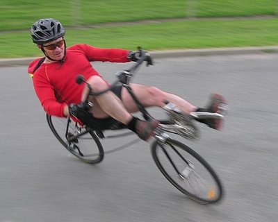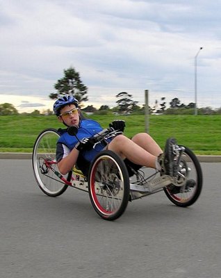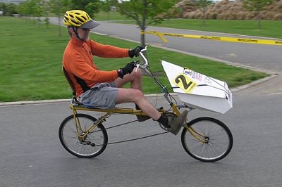 Nick Johns on his Tritation tricycle, won the CPIT HPV trophy, awarded to the best student-designed machine.