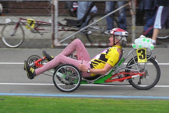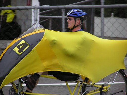 Entry #4 - John Wilson made his debut at Kiwi HPV events, riding this Easy Racers Goldrush, which had an adjustable lyra fairing.