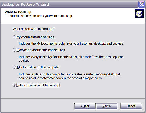 In the next dialogue box, choose your options carefully (fig. 2). In Windows XP Home edition, do not choose the third option to back up All information on this computer because it does not support ASR and the operation returns an error when trying to make a system recovery floppy disc (KB 302700). For Windows XP Professional users, if you have many tens or hundreds of GBs of data (not unusual with large hard discs) this option is inappropriate unless you are in a corporate environment and have tape backup. Although available as part of Windows XP Professional, ASR is not as user friendly as using Symantec or Norton Ghost. The last option, Let me choose what to back up is often the best to pick for the average user.