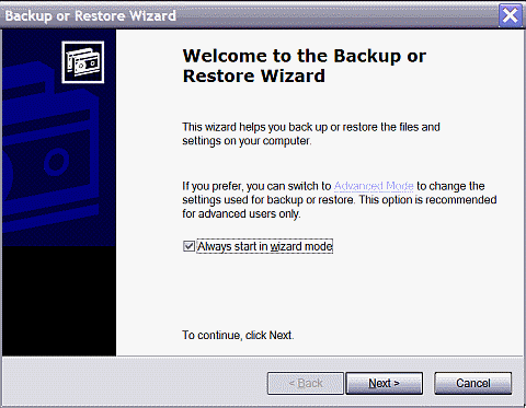 2. Running NTBackupYou'll find its icon in: Control Panel (using category menu), Or go to: Start, Run, type: ntbackup (fig. 1). Open the same wizard to do a restore. You can start in Advanced Mode by clicking the underlined link on the wizard. If you wish to always start in Advanced Mode, untick the option: [ ] Always start in wizard mode.