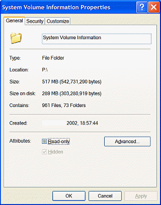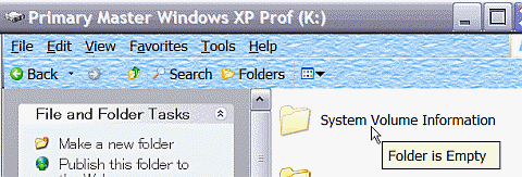 The System Volume Information folderWindows XP comes with a roll back utility called system restore that periodically stores system information from the registry for recovery purposes. By default it uses 12% of the partition space. You can turn it off or reduce the amount of disc space in System Properties, System Restore box. The folder which stores system restore data, System Volume Information (SVI) , is in the root of the system drive and is normally hidden. In NTFS partitions it has all access denied except for the system account. Hence an administrative account user (not the root system administrator) would not be able to open it. For FAT16 and FAT32 partitions unhiding the folder is sufficient to access it because there is no NTFS permission restriction. In NTFS partitions if you unhide the folder in Windows Explorer, when you mouse over it, it says the folder is empty even when you know it is not (Fig. 1). You cannot even access it from another account or installation as the example here shows: from the Windows XP installation on partition C (NTFS) looking at the SVI folder on another installation on K (NTFS).