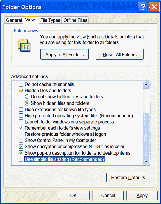 Disable Simple File SharingIf the Security tab is not visible then untick the Simple File Sharing item in Explorer, Tools, Folder Options, View tab first, click Apply and OK. (Fig. 5).