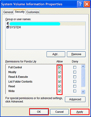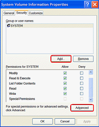 System Volume Information folder PropertiesGo to the folder properties' Security window: it shows only one user, the SYSTEM which has permissions. To add another user to this list, click Add. The Advanced button is for adding users with special permission settings and normally you would not need to set anything (Fig. 6).