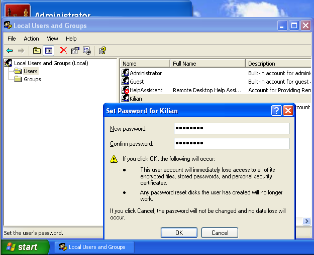 This will also work for Windows XP Professional joined to a domain if you still have the Administrator password. Figure 11 shows I've logged in as the Administrator and used the Local Users and Groups snap-in to set a new password for my other account. You can also do the opposite: log in as one of the administrative accounts and resets the Administrator account password.