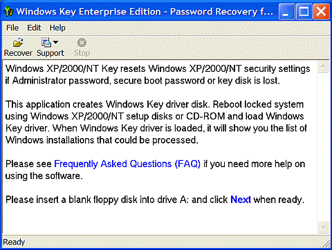 Methods to reset the Administrator or administrative user password(continued from Part 5) 6. Commercial GUI or text-mode tools6.1. Windows XP/2000/NT Key or Passware Kit EnterpriseThis is very easy to use commercial password reset tool in DOS using a floppy disk or CDR and can access NTFS volumes but requires a bootable Windows XP CD or bootable setup floppies. It resets the Administrator password to 12345 and will work in another computer. You cannot choose the new password. Passware Kit Enterprise contains tools to reset many other programmes and files, including Windows XP/2000/NT Key for resetting the Administrator password and EFS Key for lost EFS keys. A demo version is available for download. First, install the programme in Windows and run it to make a reset floppy (fig. 1).