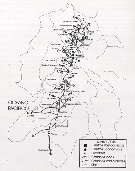 | Un mapa que representa el complejo sistema de comunicaciones en la �poca de Atahualpa en lo que hoy es Ecuador. Tambi�n est�n se�alados los lugares donde se han encontrado testimonios de fortalezas militares o pucar�es. | ||||||||||||||||||||||||||||||