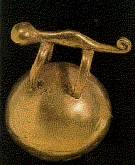 Se trata de un cascabel decorado con una figura elegantemente juguetona de un mono. La pieza está hecha de oro. La belleza es ostensible.