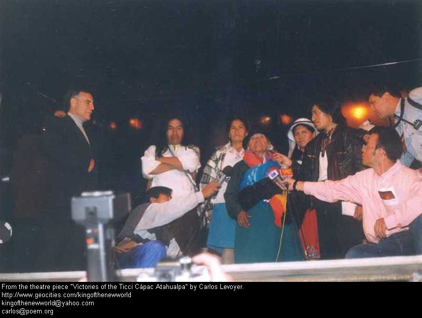 19 De izquierda a derecha: Mario Molina (Coordinador General), el escritor Hernán Rodríguez Castelo (hoy Director de Educación y Cultura del Municipio de Quito), un funcionario del Municipio que estrecha la mano de Héctor Huacho (Atahualpa) Karina García (Rava Ocllo). Atrás, de blanco, Filipillo y Orlando Paucar (Huanca Auqui), con gorra. From left to right: Mario Molina (General Coordinator), the writer Hernán Rodriguez Castelo (today Director of Education and Culture of the Municipality of Quito), a civil employee of the Municipality that narrows the hand of Héctor Huacho (Atahualpa), Karina García (Rava Ocllo). In the back, in white, Filipillo and Orlando Paucar (Huanca Auqui), with a cap.