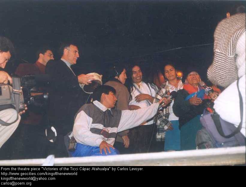 19 De izquierda a derecha: Mario Molina (Coordinador General), el escritor Hernán Rodríguez Castelo (hoy Director de Educación y Cultura del Municipio de Quito), un funcionario del Municipio que estrecha la mano de Héctor Huacho (Atahualpa) Karina García (Rava Ocllo). Atrás, de blanco, Filipillo y Orlando Paucar (Huanca Auqui), con gorra. From left to right: Mario Molina (General Coordinator), the writer Hernán Rodriguez Castelo (today Director of Education and Culture of the Municipality of Quito), a civil employee of the Municipality that narrows the hand of Héctor Huacho (Atahualpa), Karina García (Rava Ocllo). In the back, in white, Filipillo and Orlando Paucar (Huanca Auqui), with a cap.