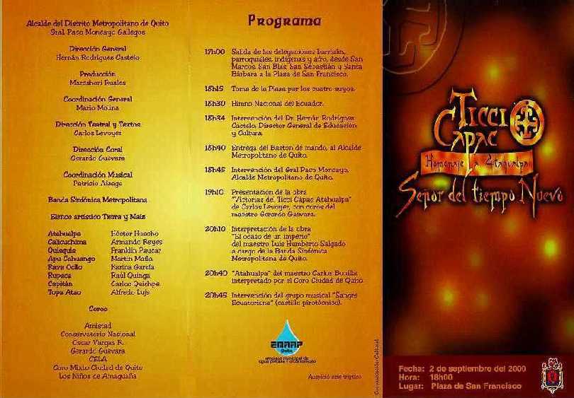 Esta página está en español y en inglés. This page is both in Spanish and English. El panfleto tiene dos caras, la primera puede verla aquí. The pamphlet has two faces, the first of wich can be seen here. El texto fue escrito por Don Hernán Rodríguez Castelo, Director de Educación, Cultura y Deportes del Municipio de Quito. El panfleto fue diseñado por Jorge Bedoya. Puede contactarlo en su correo electrónico o en estos teléfonos en Quito, Ecuador, América del Sur: (593) 02 951-406. The text was written down by Don Hernán Rodríguez Castelo, Director of Education, Culture and Sports of The Municipality of Quito. This pamphlet was designed by Jorge Bedoya. You can contact him at his e-mail or in these telephones in Quito, Ecuador, South America: (593) 02 951-406. |