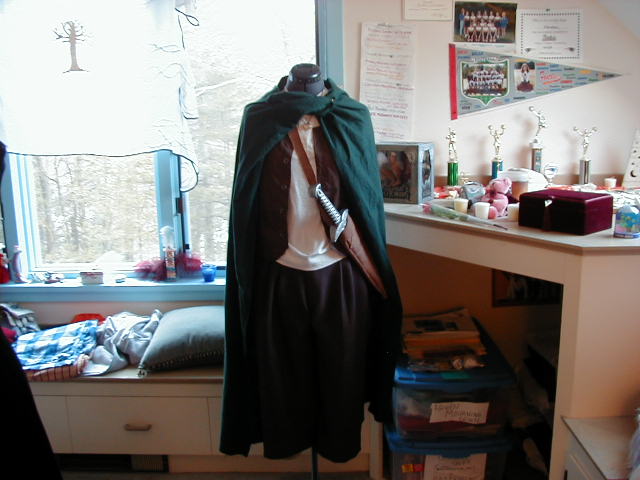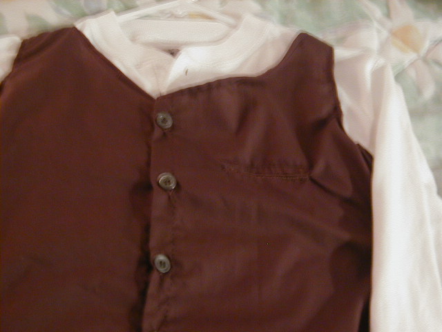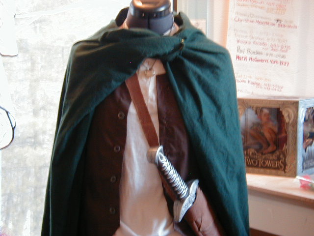 | Here's the first costume piece I ever made! (besides barbie doll clothes I made years ago, and a pillow in home ec). It's Frodo's vest for our film. Pay no attention to the white shirt-I didn't make that! I have to point out that I did NOT make the costumes perfect for our film. They are cheap, fast, but still look decent enough on film. The material's all wrong (even the color, but it's all I had on hand). I am still proud of it however :0) I drafted the pattern on my own, and hand-sewed everything! (didn't have a machine yet! Took forever to make this!) Excluding the material and the fact that it has no side pockets, I believe it is still very true to the original. There are 5 buttons down the front (which I painted silver-they were white originally), and even a welt pocket for the ring! (I'm proud of that pocket!) | ||||||||||||||||||||||