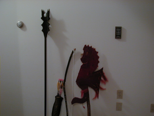 | Above: this picture does not do the props any justice. Saruman's staff, Legolas' bow, quiver, and arrows, and the firework Merry and Pippin pass back and forth in FOTR. Again, all made by Lauren. (She was in charge of the weapons). Lauren made the bow from a branch she found outside and whittled, and rope- and it really shoots good! | |||||||||||||||||||||||||||||||||||||